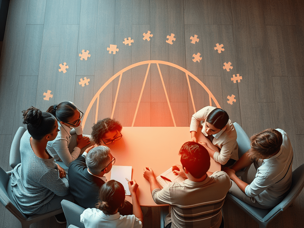Múltiples partes interesadas se sientan alrededor de la mesa, compartiendo visiones y tejiendo modelos de programas que guían la implementación.