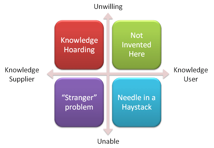Nick Milton en «Solo hay 4 tipos de barreras para la gestión del conocimiento (GC)» analiza la falta de voluntad y la incapacidad que pueden afectar tanto al proveedor del conocimiento como al usuario del conocimiento. Cualquier combinación de estos es un bloque para la gestión del conocimiento.